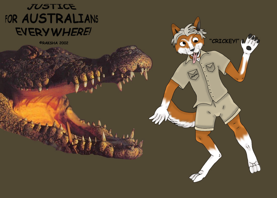Done to express my initial feelings toward Steve Irwin, for giving us Aussies a bad representation. I can not express how fucking annoying it was to hear 'G'day mate!!' from some American jackoff, thinking he was being 'amusing' every single damn day. And Steve Irwin impressions also tick me off to no end. However, I have since gotten over my intense hatred of the man, once I actualy got to watching his shows. He's a real animal lover and the work he does doesn't harm them in the least, despite what mockery there is of him out there. He's always in control, always knows what's happening. Unlike that fuck-twat Jeff Corwin, whom has now aquired my previous dislike to the extreme, from Irwin.