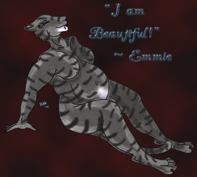 Special gift for Emmie, because she doesn't feel beautiful to herself. I wanted to express her in real life proportions, rather than the usual stick thin or imaginary sized images most 'hefty' artists like to draw thesmelves as. Why do I need to lie to her? She is beautiful the way she is, and I think this image reflects that. It's got special Nos-kitty colourations, because I wanted to express Emmie's love for her recently passed away kitty. The special ones we love are always with us, even when they die. I am very happy with this piece, I think it's one of my best pictures to date. :)