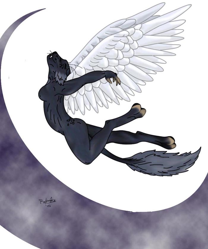 A depiction of my last (to date) dream shift. Within the dream I was myself in animal form, I then became anthromorphic in body, and ran up a tree, only to leap off the top most branch and fly. Realising it as a dream, I was eager to see myself, so I flew in front of a huge window and was able to see my own reflection. It was almost a match to what I've drawn here, including a pair of giant swan wings. I take the presence of the wings to mean the freedom in achieveing a complete and total integral inner ballence. I don't generally have wings, and they've never appeared again since that dream. The blueish 'crescent moon' represents a scythe blade.