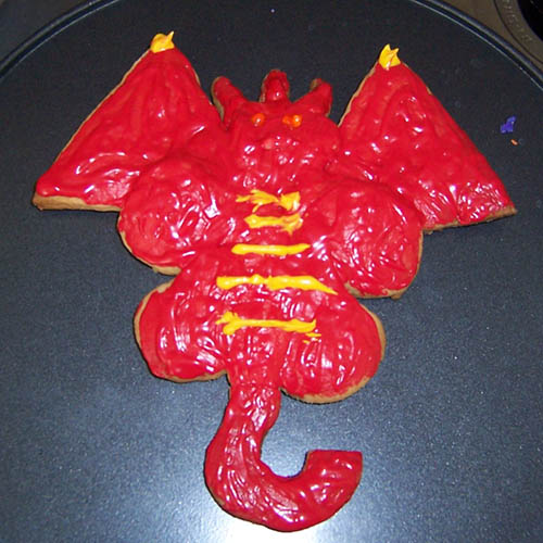 Red dragonman. The cookie was made with a basic cookie recipe, red food colouring in vanilla icing, and yellow colouring in vanilla for the markings.