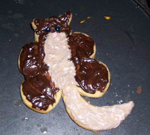 The vampy wolf. Black wolf with grey underside. The cookie was made with a basic cookie recipe, chocolate was used for the black and vanilla mixed with chocolate for the 'grey'.