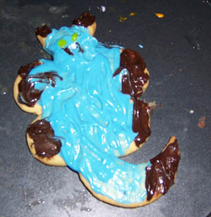 Blue foxy gal. The cookie was made with a basic cookie recipe, vanilla with blue food colouring, and chocolate for the markings.