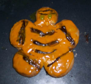 Orange tigress. The ears and tail were left out by request, thus causing her cookie to look more like a squished jelly baby or something. The cookie was made with a basic cookie recipe, red and yellow food colouring over vanilla icing and chocolate was used for the stripes.