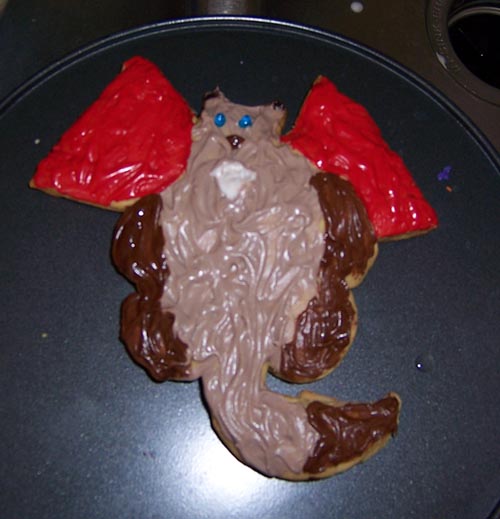 My vampywuffy lover! :D Grey wolf with dragony wings and lynx ear tufts. The cookie was made with a basic cookie recipe, chocolate and vanilla icing was mixed for the 'grey', vanilla for white, vanilla with red colouring for the wings and chocolate for the brown.