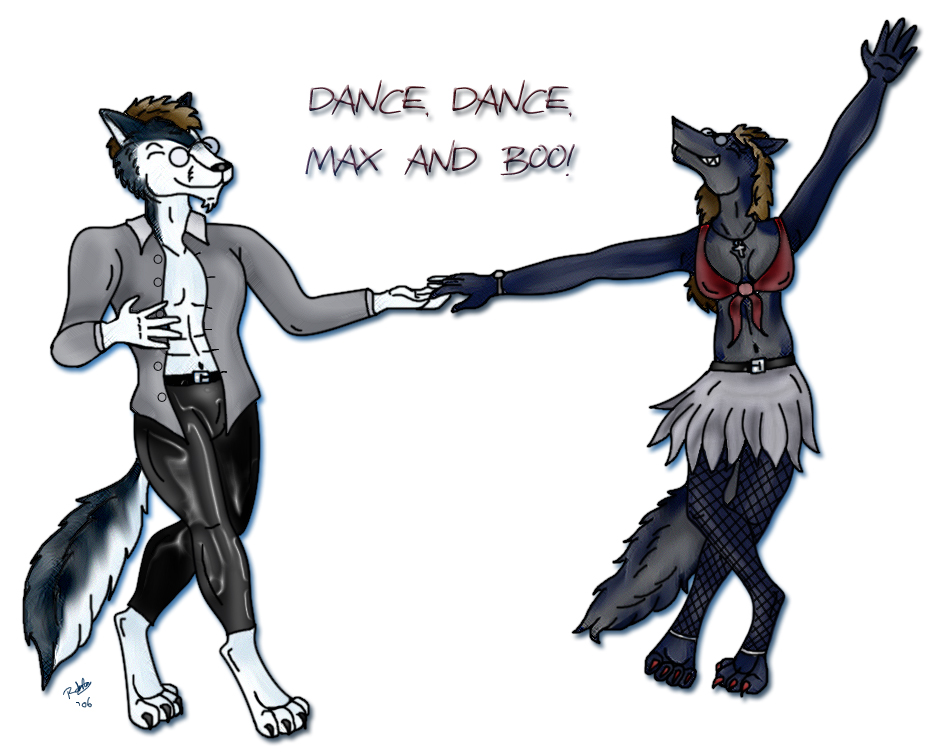 For Max and Boo. This came out so damn well. It's the first piece I've ever done that holds more than one subject - that actualy turned out almost perfect! Bullet's colour came out a lot more blue than intended, but I chalked it up to the dance lighting. Hense the blue glowy shadow around them. And yes, Boo is all girly! Mwwwahahaha. My digital colouring is really improving I think.