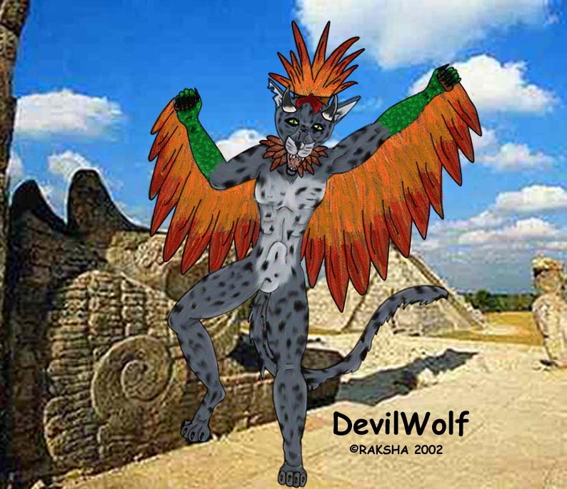 A (failed) attempt at a picture of DevilWolf, due to her interesting 'character' representation of herself. Wolf/jaguar with demonic and reptilian qualities. Represented here in a Mayan type get-up (The feathered hat and wing construction), dancing. Hence the Mayan ruins background. The final version included a drawn in shadow for increased 'realism' or something, but I couldn't find that one and I couldn't be bothered adding it in at this point.