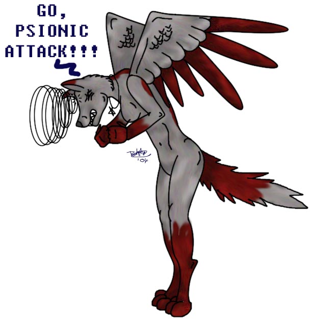 Hehehehehe... where oh where to begin with this piece? ;) OK, there's quite a few personal jokes in this one. Firstly, the subject herself. I'm sure most who know me and bullet also know 'Ms Paranoia' as we shall refer to her. The self proclaimed daughter of Anubis, the Destroyer of Worlds, Ms pheonix/jackal/angelic 'Death' herself. Now the pose. Those of you familiar with City of Heros will probably have seen a mental controller strike this pose during one of their attacks. The infamouse 'forehead thrust' with the circles of light bursting forth. Finally the words. Apparently she's a l33t wiccan who can psionically attack Bullet from a distance. Now the reason - Pure malice you might say? Only in part... Done expressly to cheer up the Bullet during a particularly bad day, in reference to the bullshit at the time that Ms Paranoia was dealing out. (See the 'StalkingBoo' voodoo doll.)