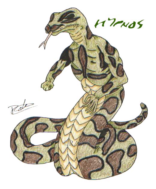 This is a portrait of Hypnos, the weresnakey. It's in the referenced section, because the entire piece is made up of two referenced existing images. The body is that of a Yuan Ti, the smaller b/w image found on page 130 of the book, 'Advanced Dungeons and Dragons Monster Manual II', minus its sword. The head belongs to one of the example hydra heads in the book, 'How to Draw Manga - Occult and Horror.' The colouration was based from our ball pythons, Suz and Nagaina.