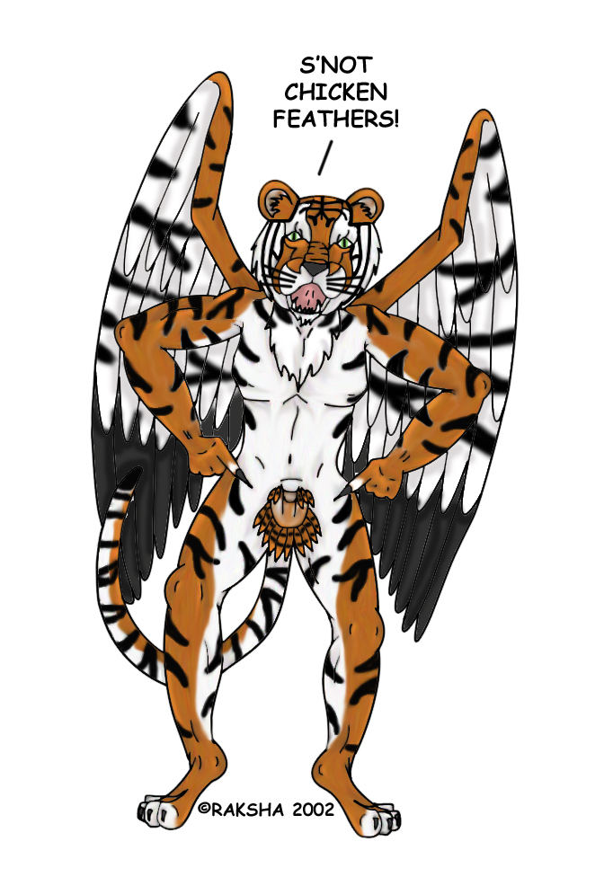 Piccy of the Rish tiggy, embodying what was a cute joke in IRC one day, about pubic feathers. The 'chicken feathers' thing is something that was between he, Bullet and Yelth, I think.