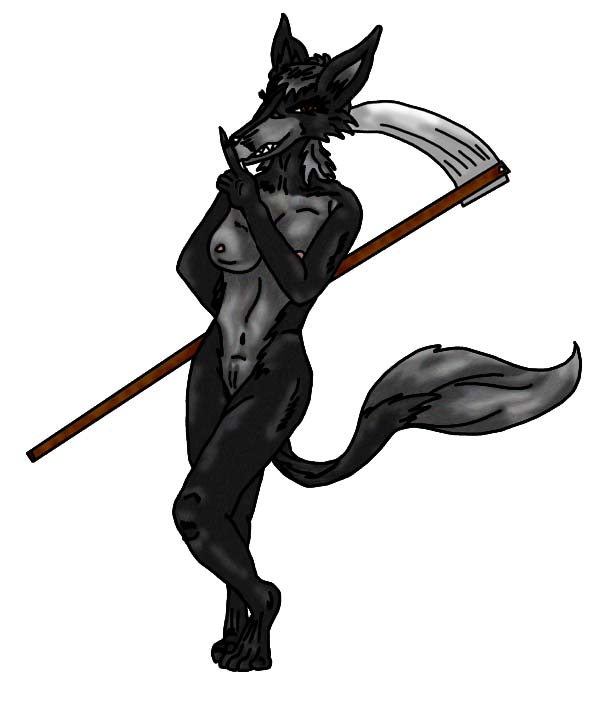 The very first image depiction of 'myself'. Grey wolf, black leopard, wielding my weapon of choice - the scythe. I was very proud of this when I'd finnished it. I still am really.
