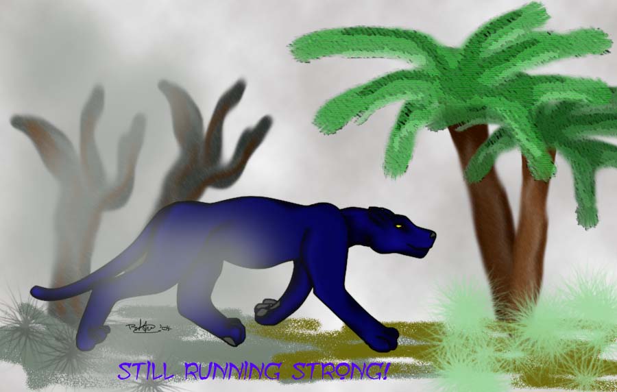 The first image done for GraFix, the wonderful midnight blue panther. After all the hardships he faced when his bitchface cunt of an ex (Was my view of her, NOT his. The gracious man has never thought so pointedly ill of her as I did) put him through unbelievable shit and strife, he was and is still running strong. The image depicts him coming out of the ashes of his hardships, and into the green new growth of furture success. I am happy to say that he IS succeeding extremely well too! Congratulations pantherman. *snugglies*