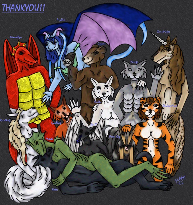 A big thankyou picture for all those who wished me well during my hysterectomy surgery. Once again the quality seemed to diminish with the number of people, though I did try hard. Oh well, it still expresses everything it was suposed to. Canis' leg is missing too. Blah. People featured (if you can't read the words) are: AtmanRyu the dragon, Arylkia the chaosian, Gogscer (Shuck) the bear, Haruga the 8 boobed wolf, CanisMajor the unicorn, ShadowsMyst the tiger, Oscar Gog the dog (Gogscer's doggie), Strill the fox with the blue nose, Arikla the winged wolf, Kynewolf the orange wolf, Rainwolf the white wolf, Mokele the lizardman, and Keller the leopard.