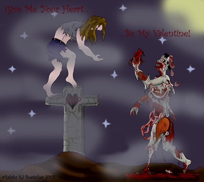 Yay, Valentine's Day! Of course my celebration of this day has severe dark overtones. My zombie man is so sechsay! Yes that is his penis that's fallen off in rotten danglie fun. I love zombies. That humanish thing is me. I suck at the humans. :P